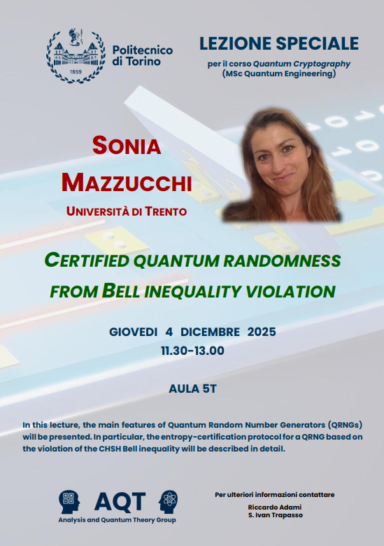 Aula Magna – Dipartimento di Fisica UniTO Via Pietro Giuria 1, TorinoWe are very happy to announce the next QuanTO Lecture! This joint initiative is the result of the scientific cooperation among researchers from the Departments of Physics and Mathematics of Politecnico di Torino (DISMA-DISAT) and Università di Torino. The forthcoming event of this series will take place on March 27th, 2026. We are pleased to host […]